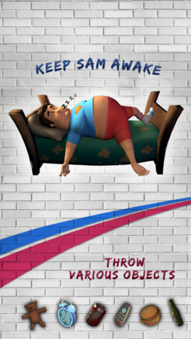 《贪睡的山姆(Slumber Sam)》是一款有趣的整蛊游戏。想象一下你有一个特别爱睡觉的朋友山姆,他又肥又懒,无时不刻都在打瞌睡,但是你不想让他睡得安稳。因此游戏中,你需要做的就是尽一切可能不让他睡着!游戏中将为你配备一个泰迪熊,汉堡包,瓶子以及闹钟等等。投掷不同的物品将得到不同的效果。总之,让山姆不准再睡啦!