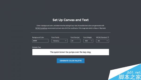 你可以选择一个背景色,然后网站就会根据你选择的背景色给出不同的文字色彩搭配方案。